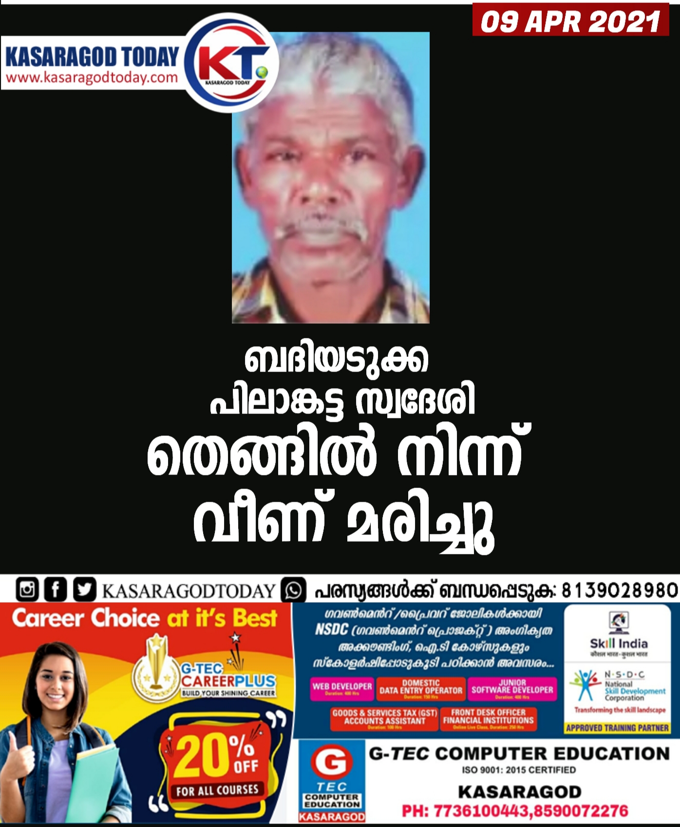 ബദിയടുക്ക: തെങ്ങില് നിന്ന് വീണ് തൊഴിലാളി മരിച്ചു. പിലാങ്കട്ട രാജീവ്ഗാന്ധി കോളനിയിലെ ബാബു (60)വാണ് മരിച്ചത്. ഇന്നലെ ഉച്ചയോടെ വീട്ടുമുറ്റത്തെ തെങ്ങില് നിന്നാണ് വീണത്. ഉടന് തന്നെ ചെങ്കളയിലെ ആസ്പത്രിയില് എത്തിച്ചുവെങ്കിലും അപ്പോഴേക്കും മരിച്ചിരുന്നു. ഭാര്യ: പരമേശ്വരി. മക്കള്: ലീല, ഗണേശ. മരുമക്കള്: ഷാജി, അനിത. സഹോദരന്: കുമാരന്.