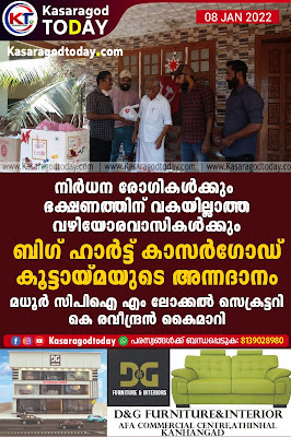 കാസർകോട് :നിർധനരായ രോഗികൾക്കും വഴിയോരങ്ങളിൽ ഒരു നേരത്തെ ഭക്ഷണത്തിന് പോലും കഴിവില്ലാത്ത ആൾക്കാർക്കും  BIG ❤️ HEART കാസർഗോഡ് കൂട്ടായ്മയുടെ ഭാഗമായുള്ള  അന്നദാനം മധൂർ സിപിഐ എം ലോക്കൽ സെക്രട്ടറി കെ രവീന്ദ്രൻ ഇൽ നിന്ന് ലോക്കൽ കമ്മിറ്റി മെമ്പർ വി സുധാകരൻ  വിതരണത്തിനായി ഏറ്റുവാങ്ങുന്നു മധൂർ ഗ്രാമപഞ്ചായത്ത് മെമ്പർ ബഷീറും ഭാരവാഹികളായ ലുക്മാൻ ഷാഫി നൗഷാദ് ഉളിയത്തടുക്ക നവാസ് പുളിക്കൂർ നൗഷാദ് വിദ്യാനഗർ റിയാസ് ഹനീഫ  ഉളിയത്തടുക്ക ലത്തീഫ് എരിയാൽ രാകേഷ് തമ്പാൻ  അഡ്വക്കേറ്റ് ഇക്ബാൽ നെല്ലിക്കുന്ന് ജാഫർ നെല്ലിക്കുന്ന് അസ്കർ നെല്ലിക്കുന്ന് ഷാഹിൻ വിദ്യാനഗർ സജിത്ത് മന്നി പാടി നഗർ സുനീഷ് വിദ്യാനഗർ നാസർ എറണാകുളം കുളം എന്നിവർ സംബന്ധിച്ചു,